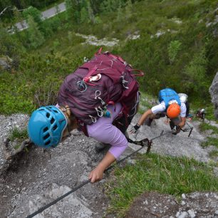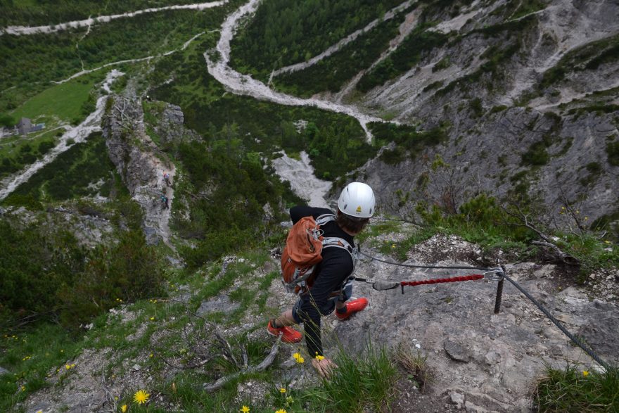 Hned úvodní pasáže jsou celkem vzdušné, a tak předvádíme turistům dole pěknou show. Po prvním skalním výšvihu nás čeká další lanový most mezi skalními věžemi, po kterém prověří naše síly ještě dva traverzy obtížnosti D v mírném převisu nebo delší pasáže v kolmé stěně, naštěstí ale s dostatkem železných kramlí na nohy. Výstup s převýšením 130 m trvá hodinu a rozhodně není pro začátečníky.