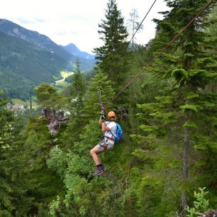Naším dalším cílem je skalnatá soutěska Silberkarklamm, kterou protéká bystrá říčka, padající z několika kaskád a vodopádů. Po dřevěných mostcích procházíme nad dravým proudem k lanovému mostu, kterým začíná poměrně náročná ferata Hias (D).