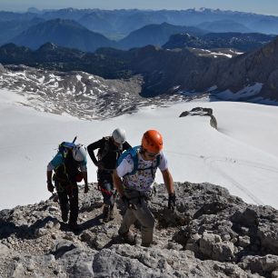 Výhledy užíváme dobrou půl hodinu, výhodou časně ranního výstupu v pondělí je minimum lidí na vrcholu. Jakmile provoz začíná houstnout, dáváme se na ústup kratší feratou přímo na ledovec, po kterém zajištění lanem sbíháme a nabíráme rozbředlý sníh do bot.