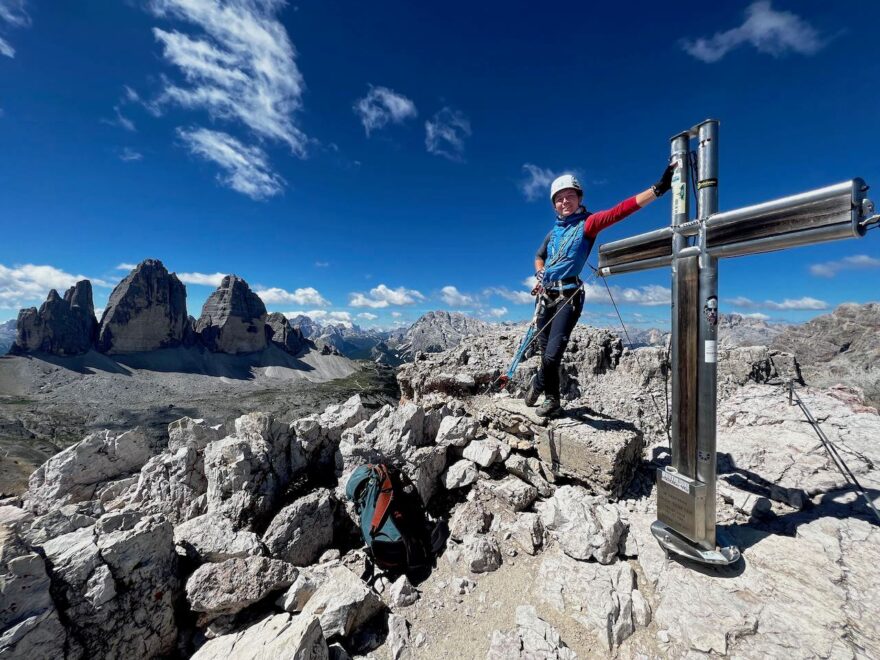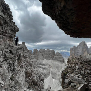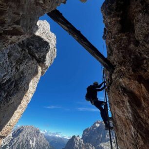 Den druhý nabíráte výšku po turistickém chodníku, krása střídá nádheru, paměťová karta dostává zabrat, a jakmile dosáhnete Forcella dei Laghi, obléknete sedák, nasadíte helmu a pokračujete v traverzování zajištěnou cestou Sentiero delle Forcelle (B). Tahle příjemná spojka vás dostane pod Paternkofel z východu, je dobře odjištěná, a pokud nemáte problém s nezajištěným exponovanějším terénem, rozhodně si trasu prodlužte o výstup na samotný vrchol Paternkofel (místy lezecké úseky II UIAA). K Dreizinnenhütte, místu dalšího noclehu, sestupujete opět zajištěnou cestou a v závěru i dlouhými vojenskými tunely, čelovku proto rozhodně s sebou!