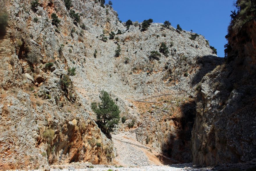 Letecký pohled na Agia Roumeli na pobřeží Libyjského moře, kde ústí soutěska Samaria, Kréta.