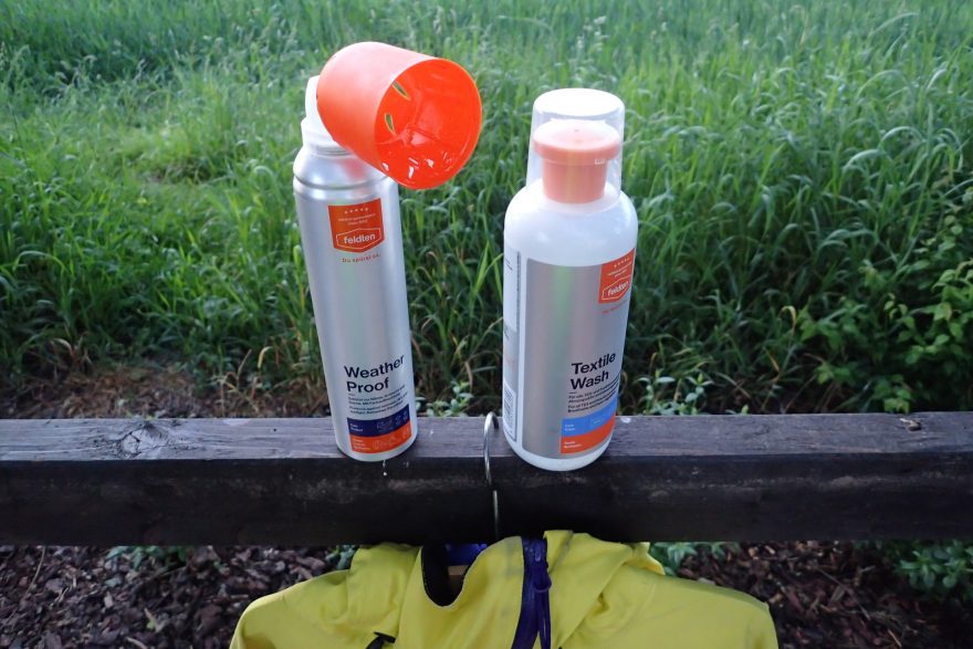 Aplikace feldten Power Cleaneru na rukáv hardshellové bundy.