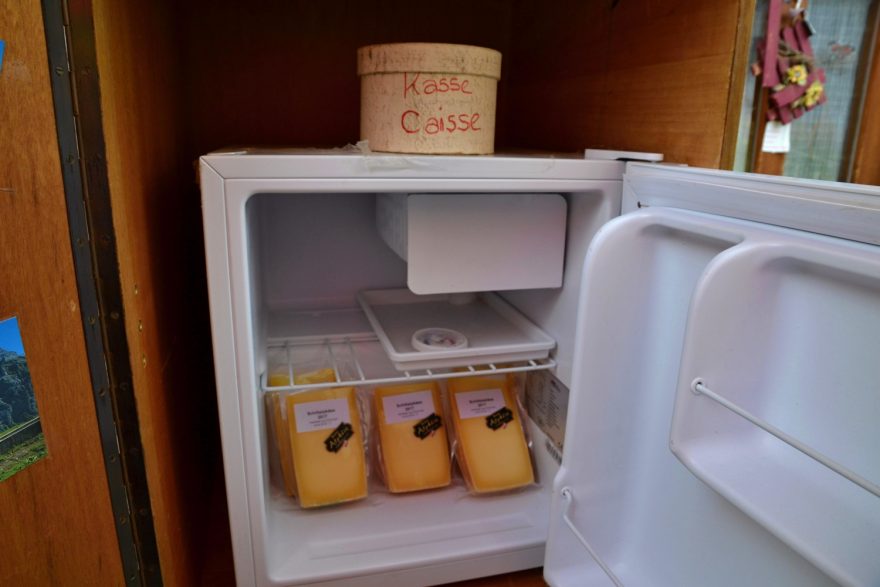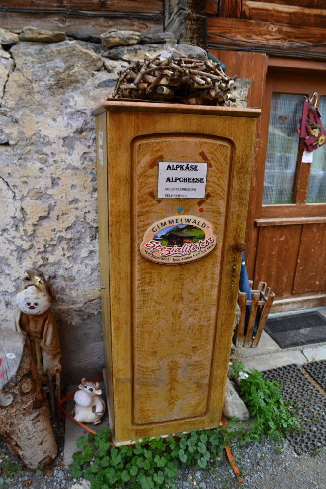 Skříňka na prodej domácího sýra, Gimmelwald, Švýcarsko.