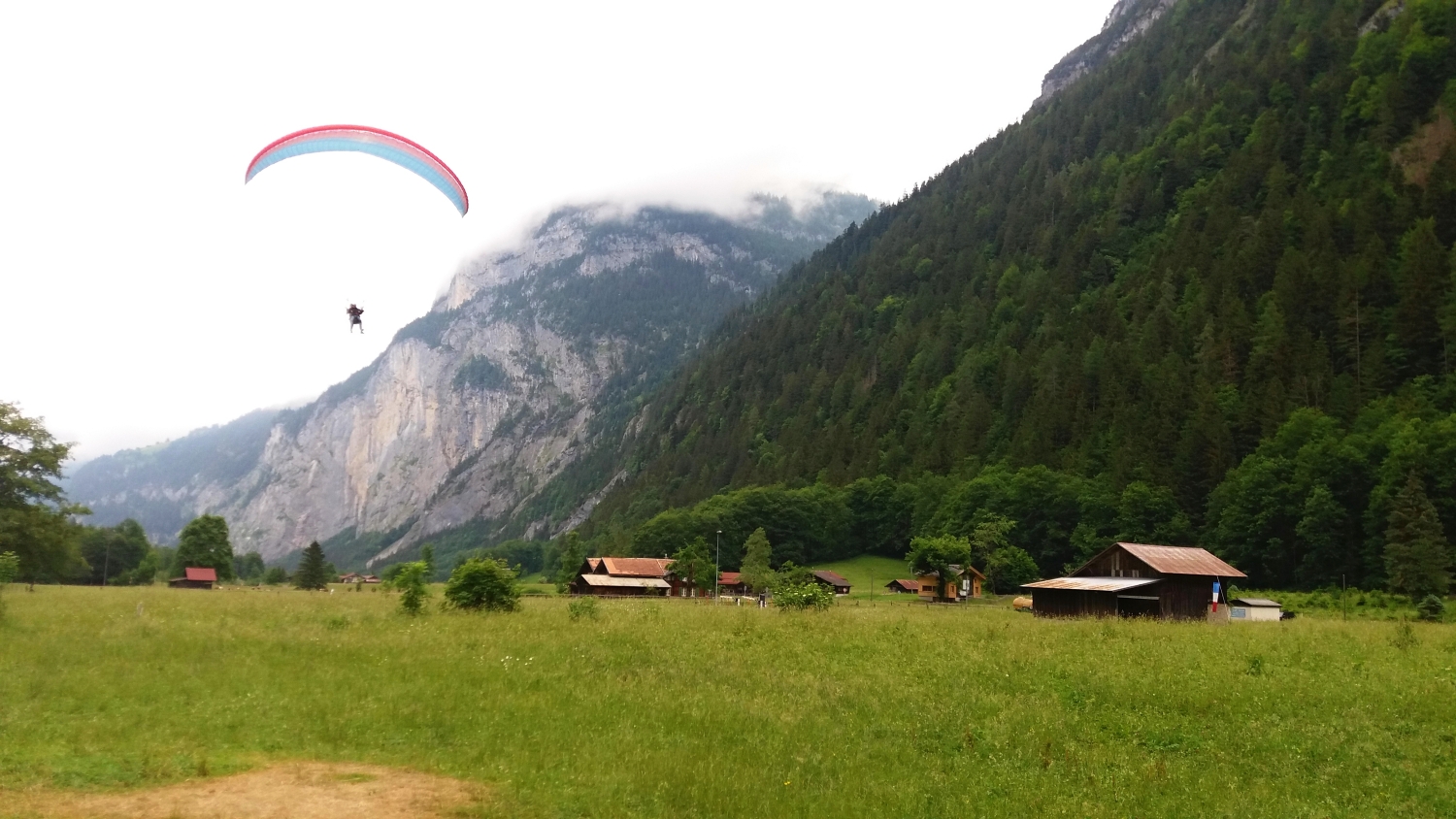 Paraglide přistává na louce ve Stechelbergu, Švýcarsko.