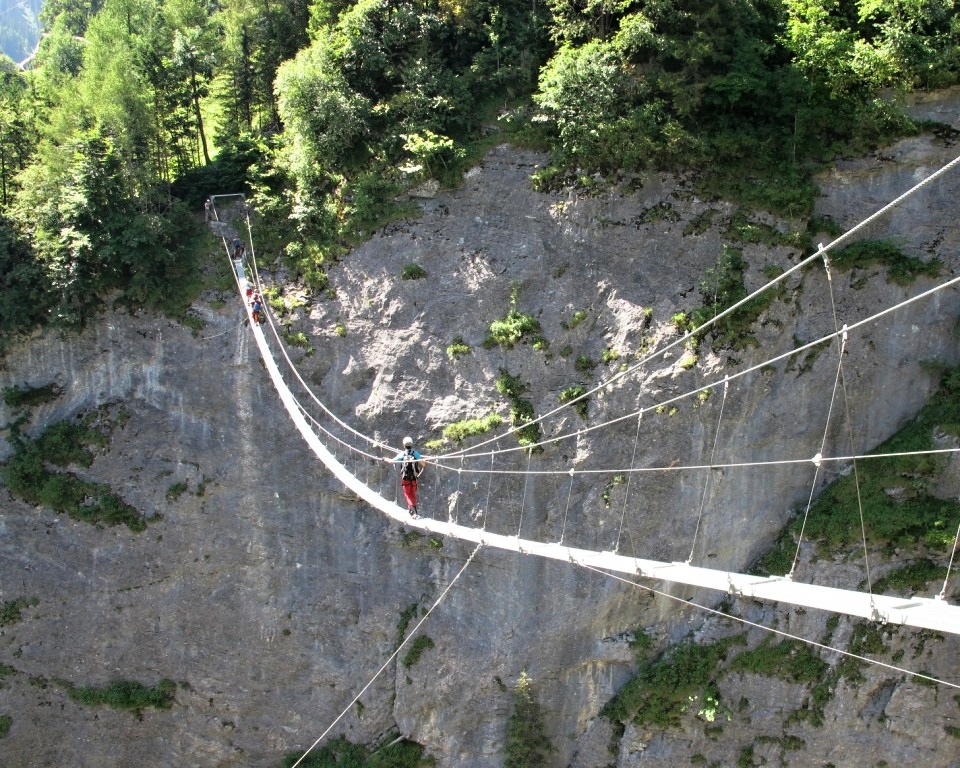 Lanový most nad propastí – Mürrenklettersteig, Švýcarsko.