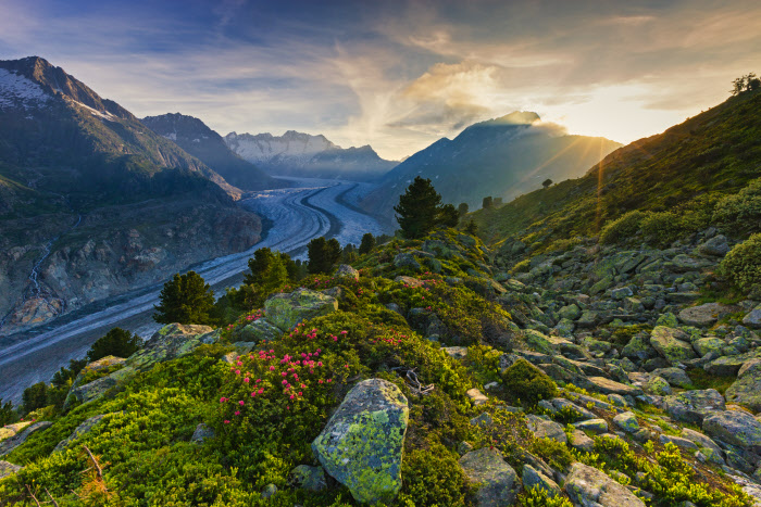 V okolí je velké množství turistických tras, Aletschský ledovec, Švýcarsko