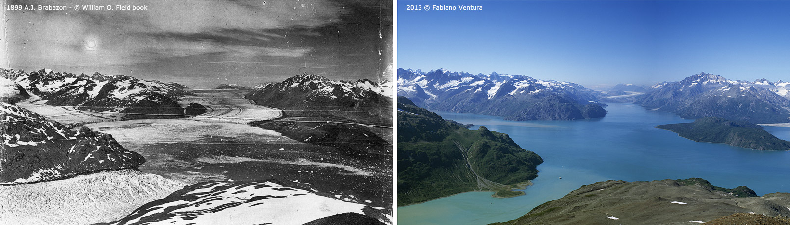 Několika kilometrový ústup ledovců Johns Hopkins a Grand Pacific (Aljaška), foto: F. Ventura/A.J. Brabazon
