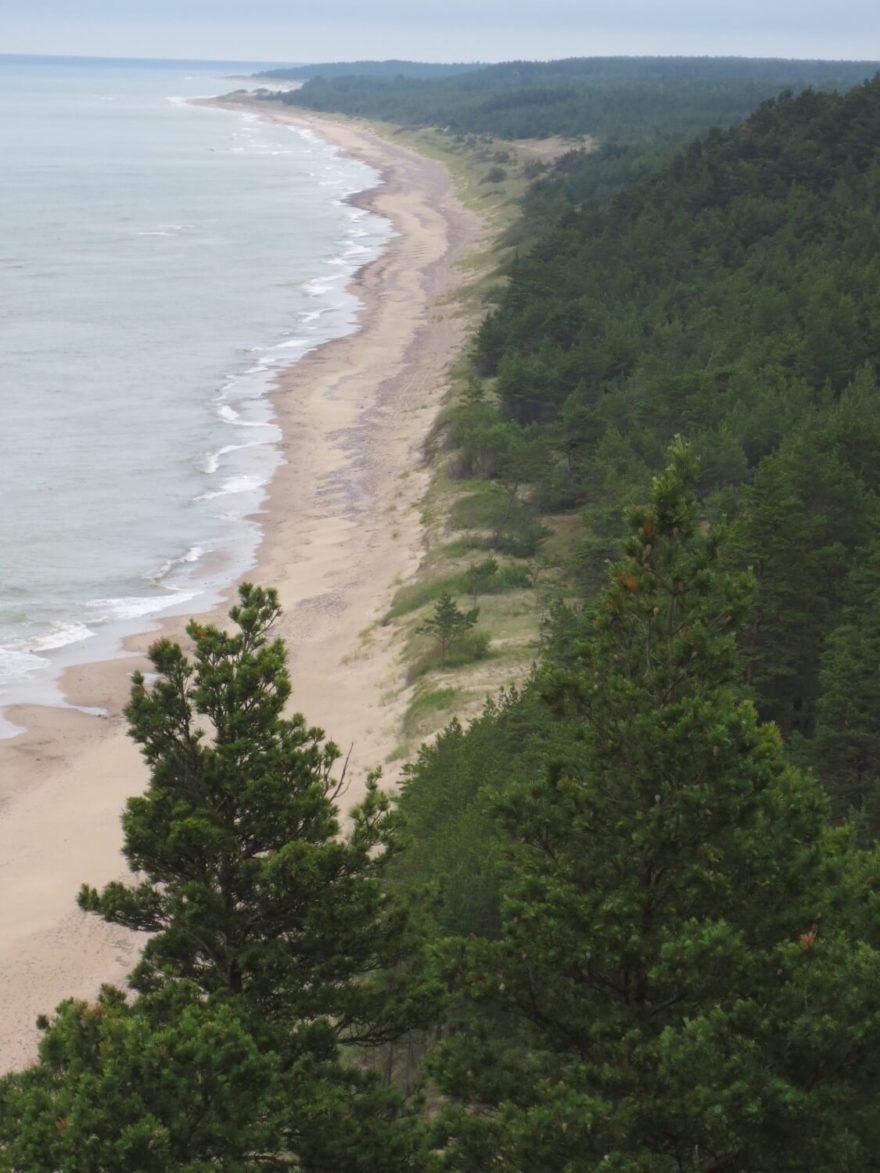 Úsek po zarostlých plážích mezi městečky Svētciems a Ainaži v Lotyšsku nedaleko estonských hranic. Baltic Coastal Hiking Route
