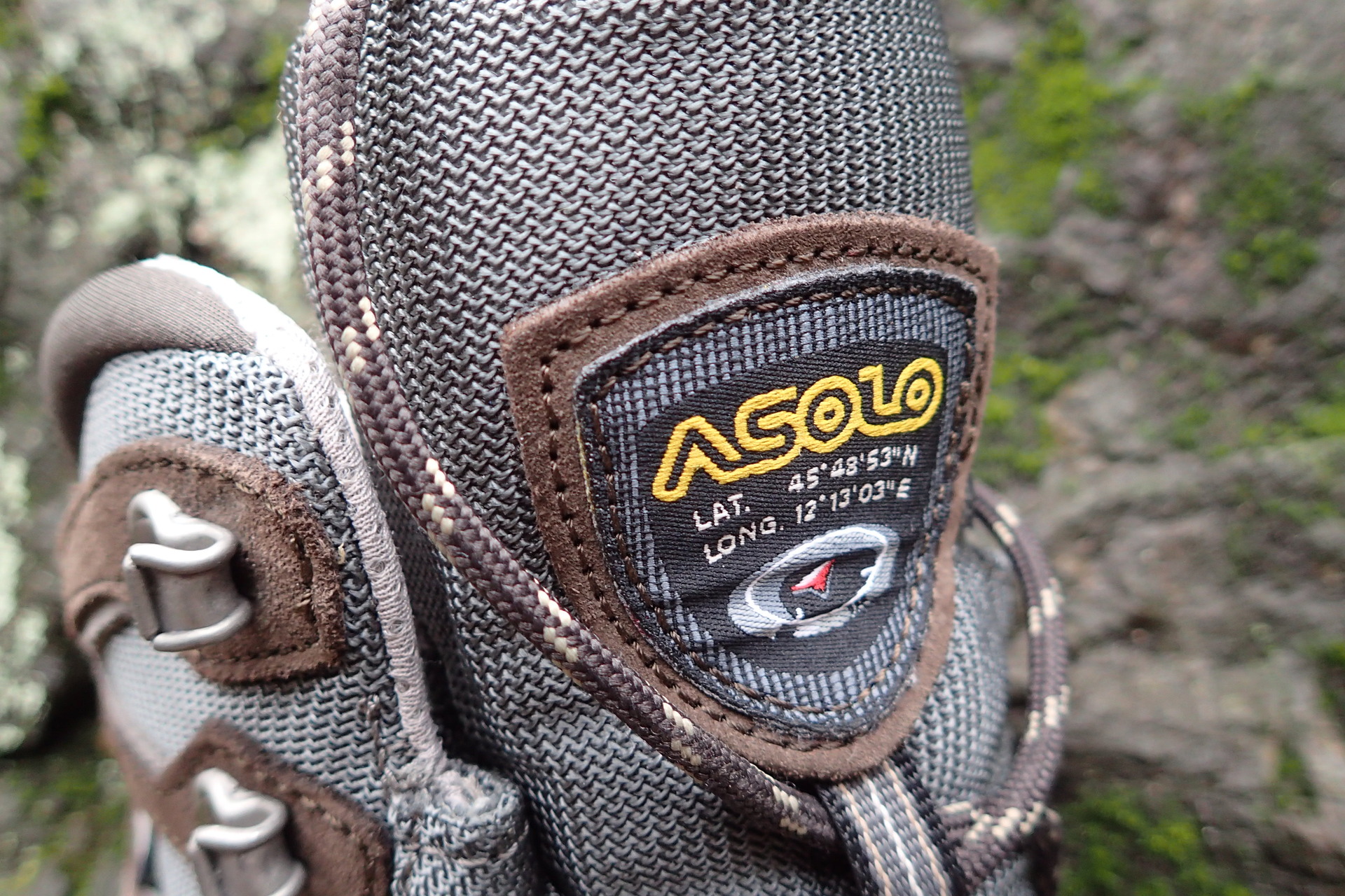Detailní záběr na jazyk boty s logem ASOLO a GPS souřadnicemi. Kam asi vedou?