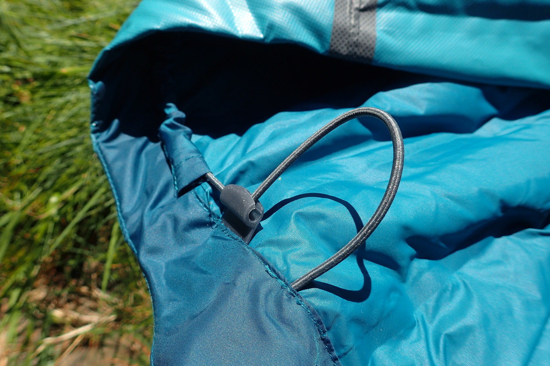 Po zatažení kapuce stačí pružnou tkanici jenom zaseknout do V výřezu a drží.