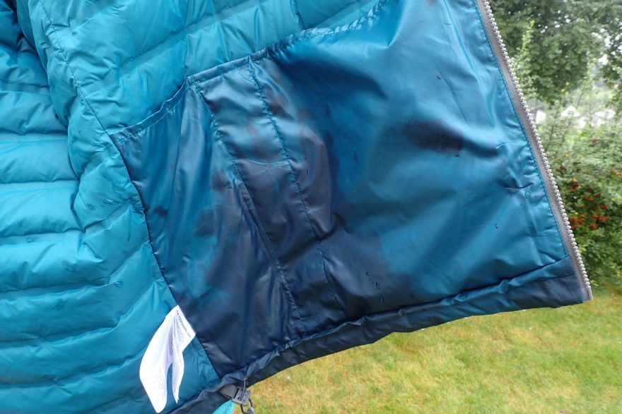 Způsob lepení a struktura 15 mm široké pásky na bundě Columbia OutDry Ex Gold Down Hooded Jacket.