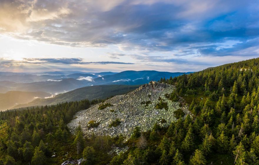 Stezka v oblacích pod vrcholem Slamníku v Dolní Moravě.