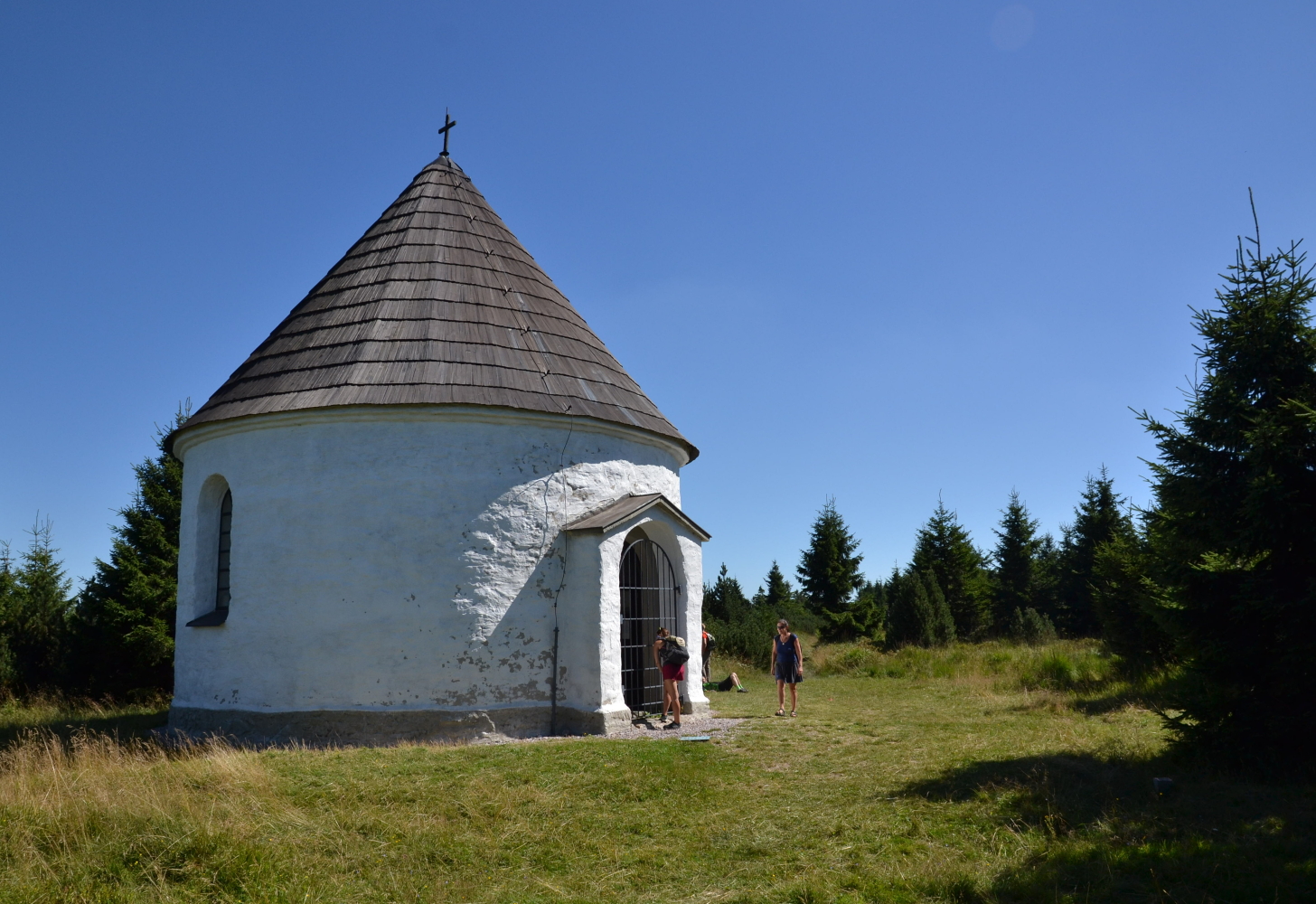 Běloskvoucí rotunda Kunštátské kaple na hřebeni Orlických hor.