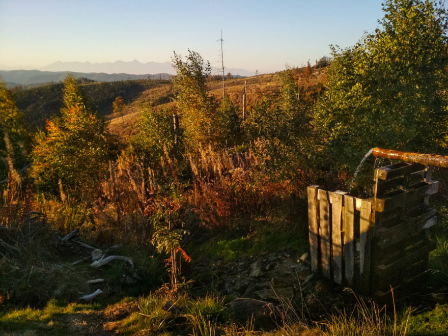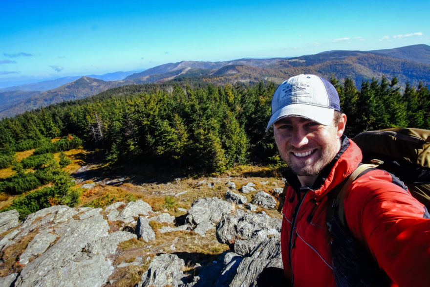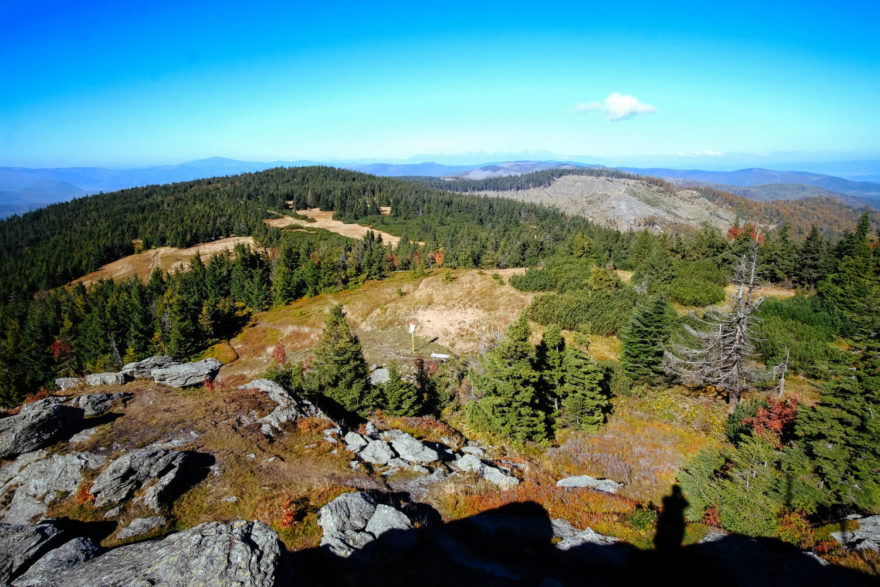 Široké rozhledy z vrcholku Volovec (též Skalisko, 1293 m) ve Volovských vrších. Cesta hrdinů SNP, Slovensko.