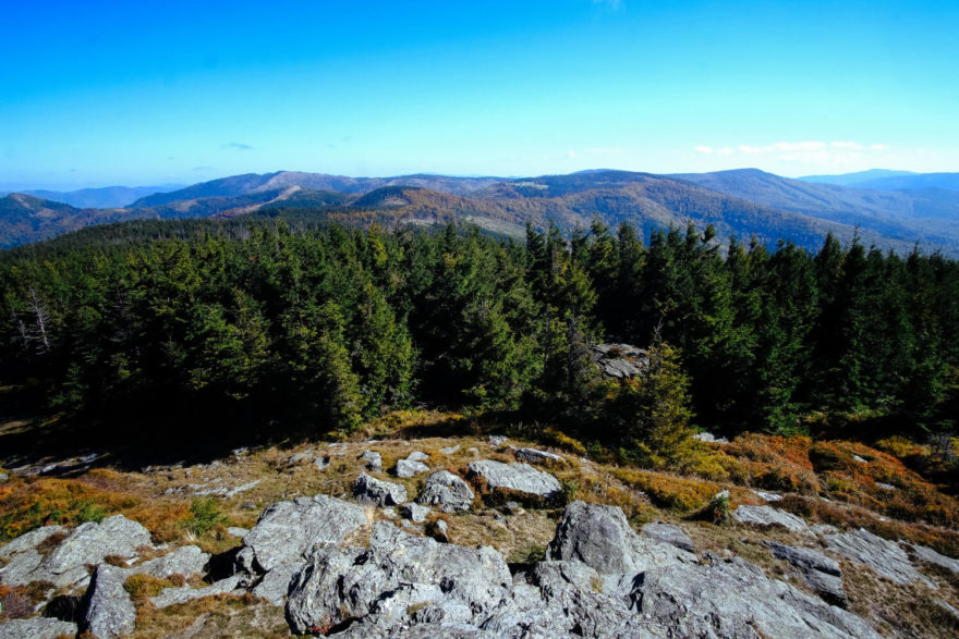 Výhledy z vrcholku Volovec (též Skalisko, 1293 m) ve Volovských vrších. Cesta hrdinů SNP, Slovensko.