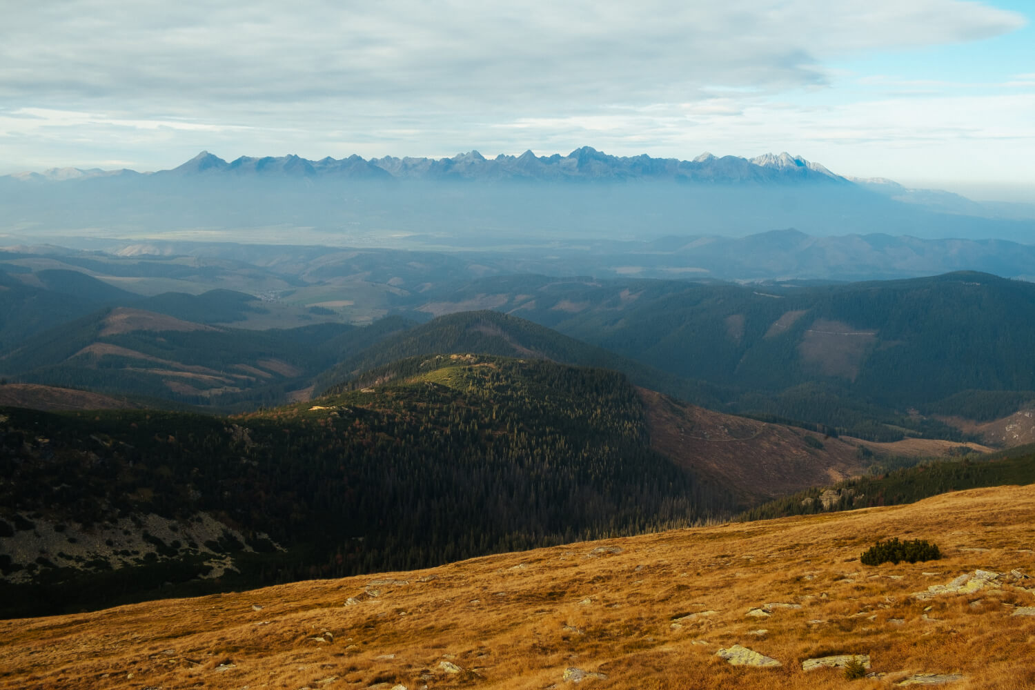 Výhledy na Vysoké Tatry z vrcholu Kráľova hoľa (1946 m) v Nízkých Tatrách.