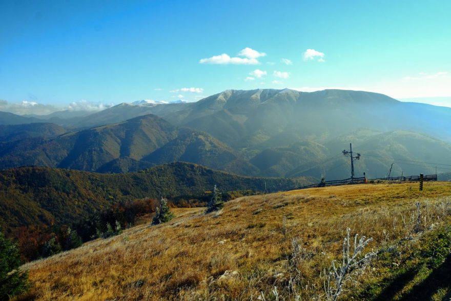 Nad Donovaly: pohled na hřebeny Nízkých Tater z jižní výspy Velké Fatry. Cesta hrdinů SNP, Slovensko.