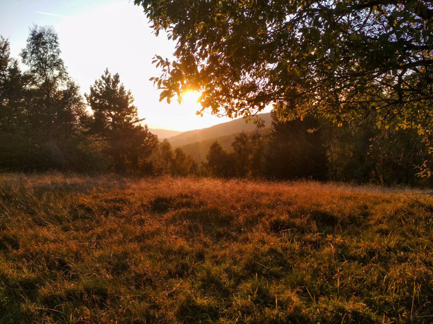 Západ slunce na vrcholu Čergov (1050 m) ve stejnojmenném pohoří na severu Slovenska. Cesta hrdinů SNP.