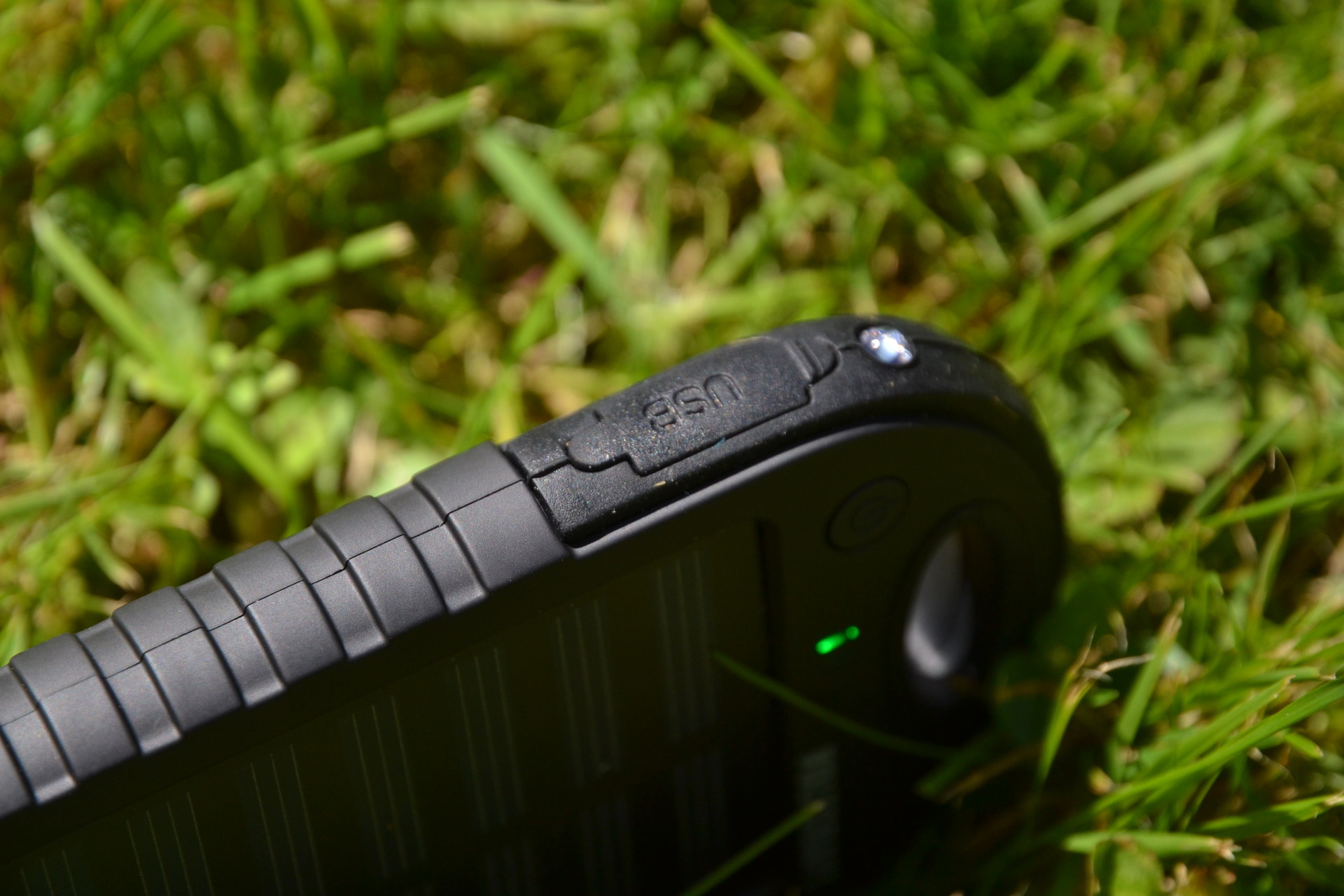Detailní pohled na Output 5 V s DC 2.1 A a malým LED světlem pro nouzové posvícení.