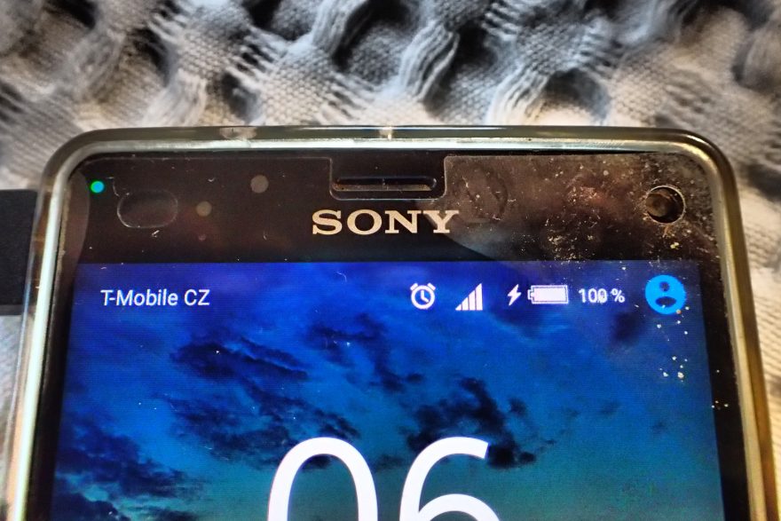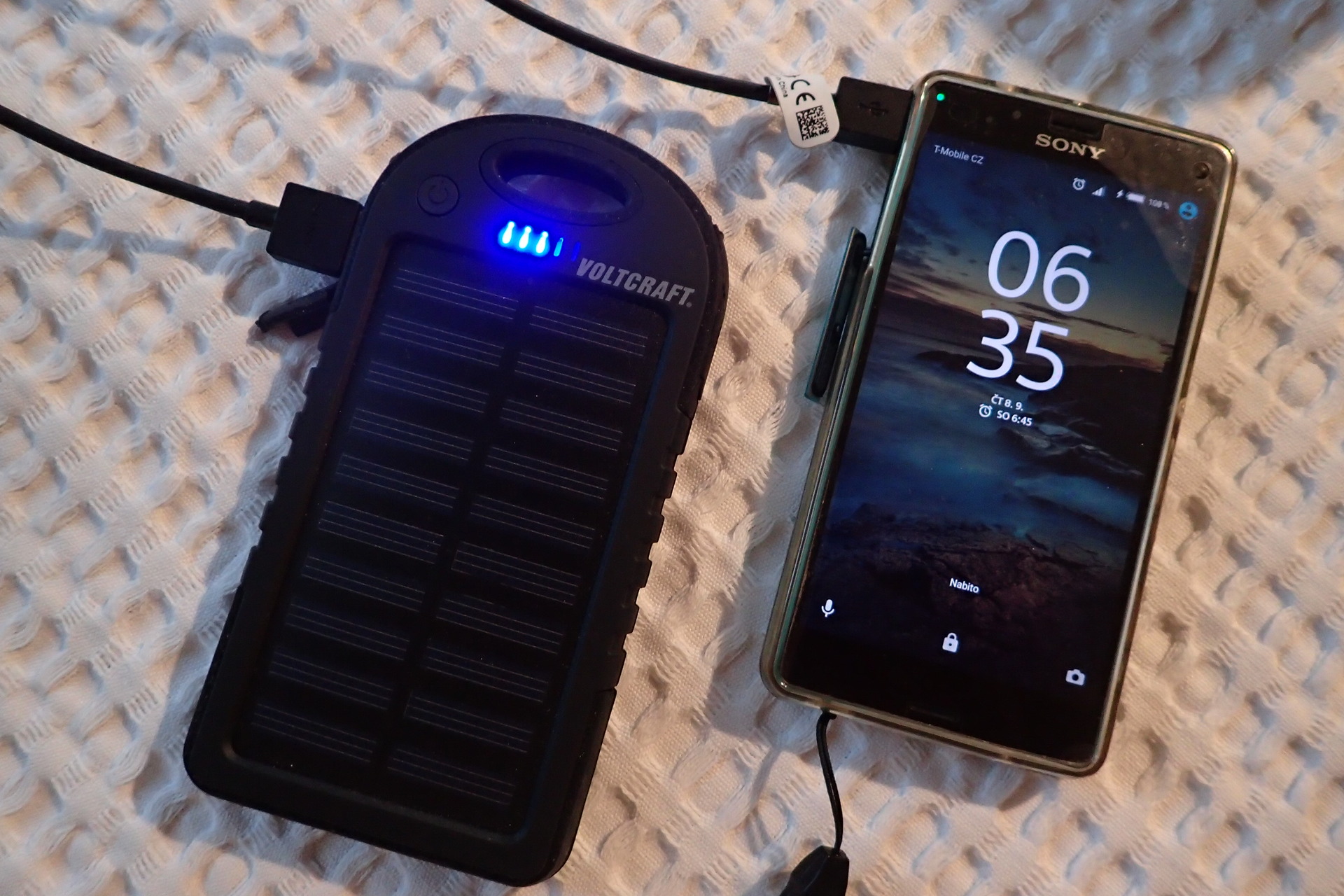 Telefon SONY je nabitý z 10 na 100% a na solární nabíječce zbývá ještě cca 60%. Odhad podle počtu modrých dílku.