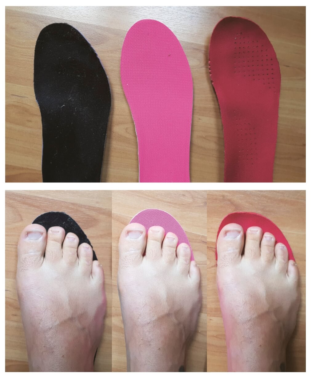 Na obrázku vidíte vložky z bot jedné běžkyně. Již podle tvaru jde dobře odhadnout, o jaký typ boty se jedná (zleva – závodní maratonka, klasická objemovka a trialová bota s širokou špičkou). Při vyjmutí vložky, jde krásně vidět, jak moc se noha v botě musí zmáčkout, aby se tam všela. Přesto při vyjmutí noha přes vložku „přetéká“. Upozorňuji, že běžkyně v těchto všech botách má odběhanou již slušnou porci kilometrů. Zkuste si to doma také!