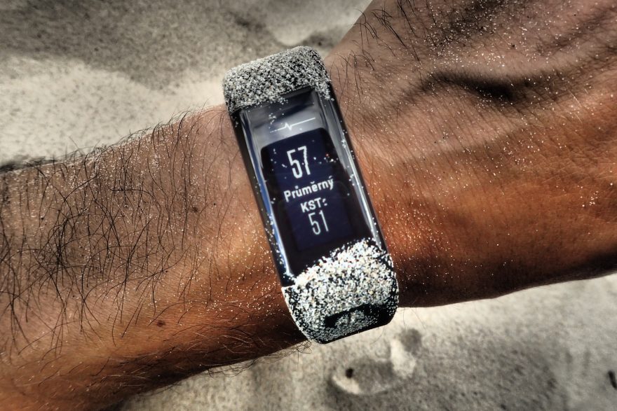 Aktivní optický snímač tepové frekvence na náramku GARMIN Detail na optický snímač tepové frekvence na náramku GARMIN Vívosmart HR+ svítí zeleně.