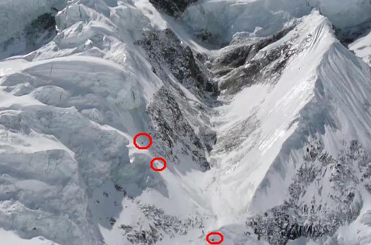 Červená kolečka představují horolezce, kteří jakko zázrakem nebyli vůbec zraněni