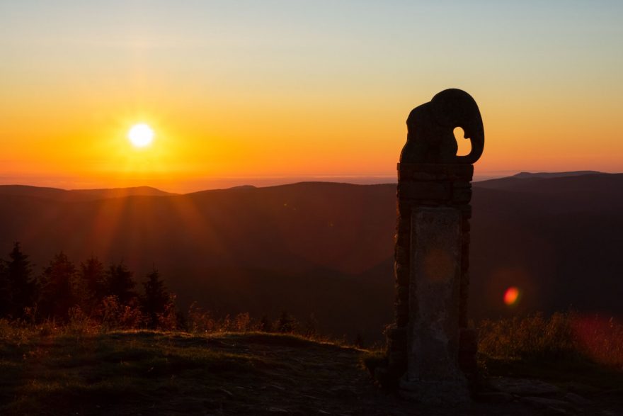 Západ slunce u sochy slůněte na Králickém Sněžníku.