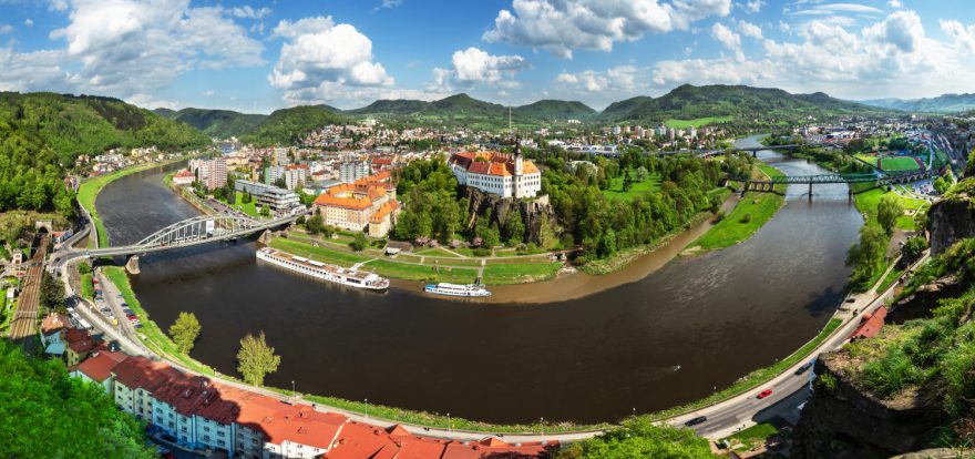 Děčínský zámek se vypíná nad soutokem Labe a Ploučnice.