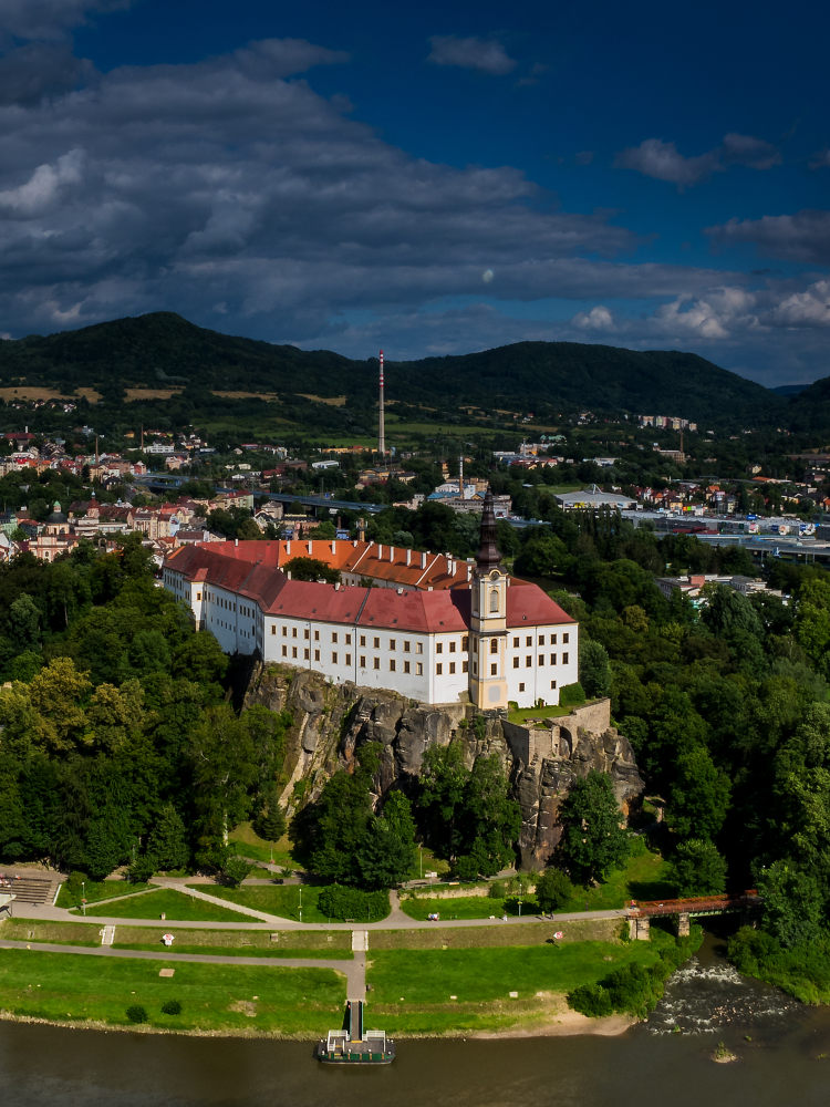 Děčínský zámek se vypíná nad soutokem Labe a Ploučnice.