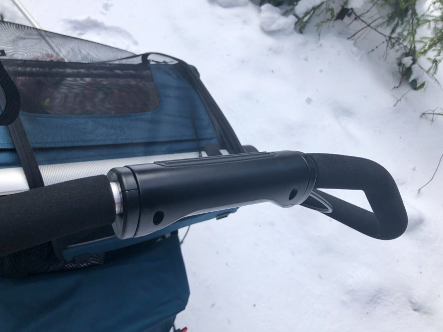Multifunkční dětský vozík Thule Chariot Cross 1 s lyžařským setem je při sjezdu stabilní.