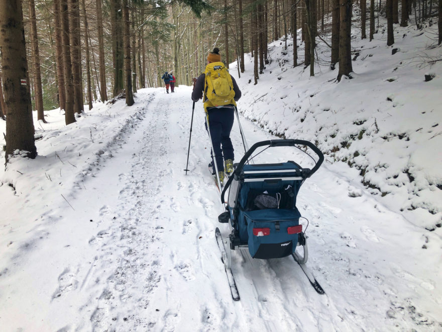 Lyžařský set kočárku Thule Chariot Cross se skládá ze dvou lyží, dvou teleskopických tažných tyčí a polstrovaného opasku.