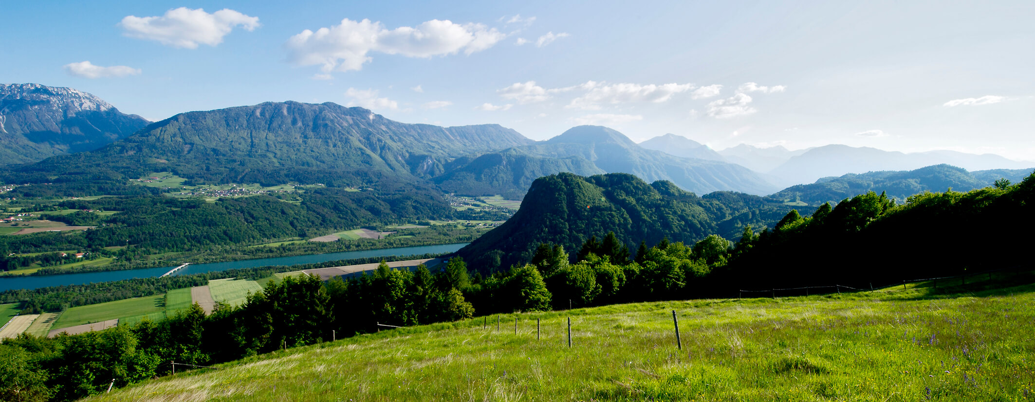 Malebné údolí Rosental, kterým protéká řeka Dráva, se táhne v délce asi 40 km na jihu Korutan, Rakousko.