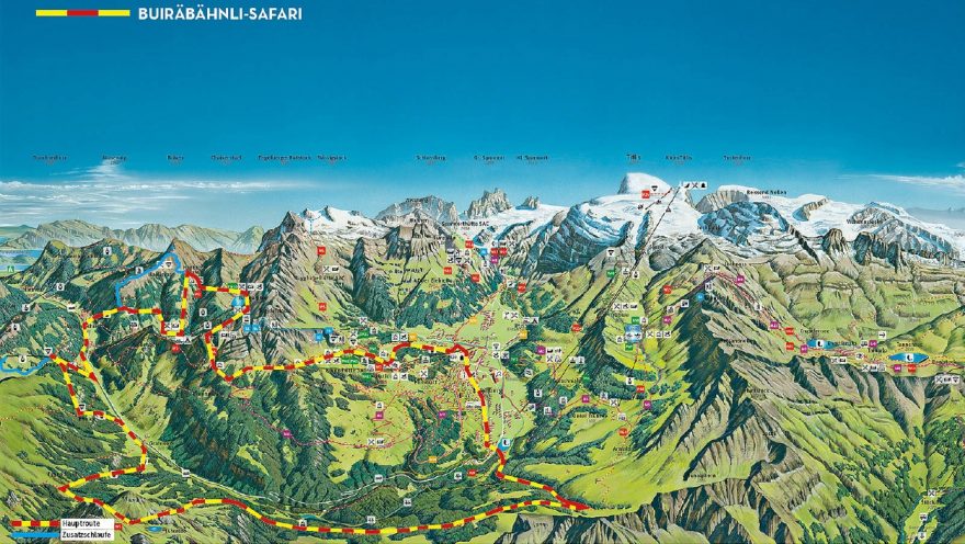 Okruh Buiräbähnli Safari po tradičních farmách v údolí Engelbergu, Švýcarsko.