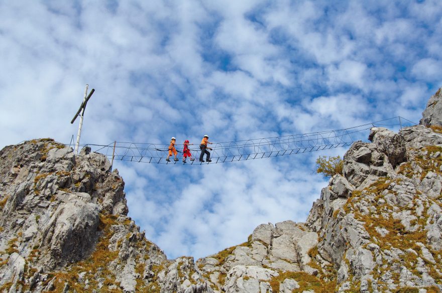 Lanový most Engelsbrücke vede od vrcholového kříže Brunnistöckli k žebříku Himmelsleiter, Švýcarsko, Engelberg.