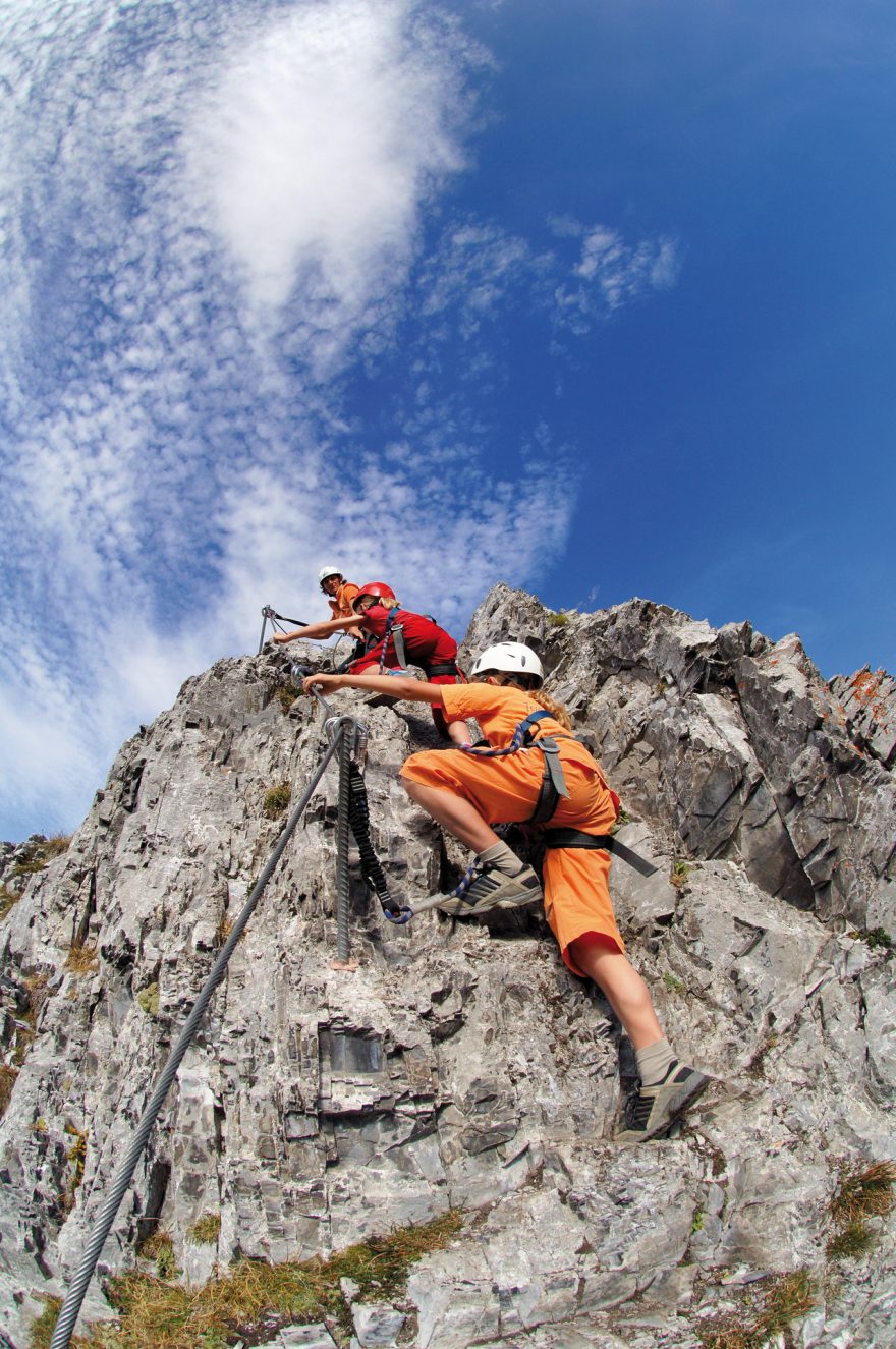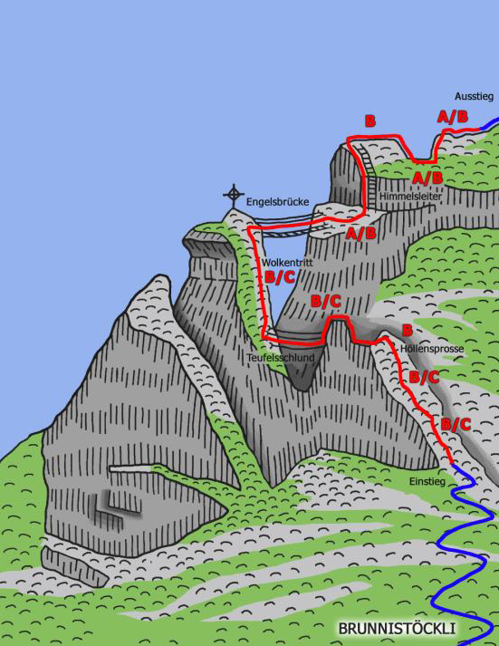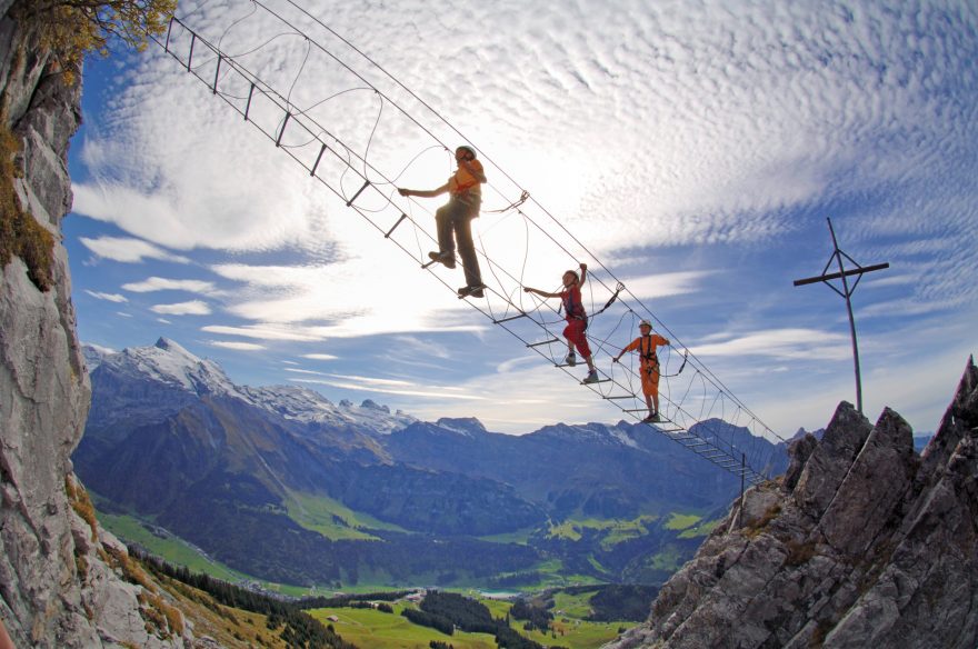 Úvodní strmá pasáž s pomocnými kramlemi, Švýcarsko, Engelberg.