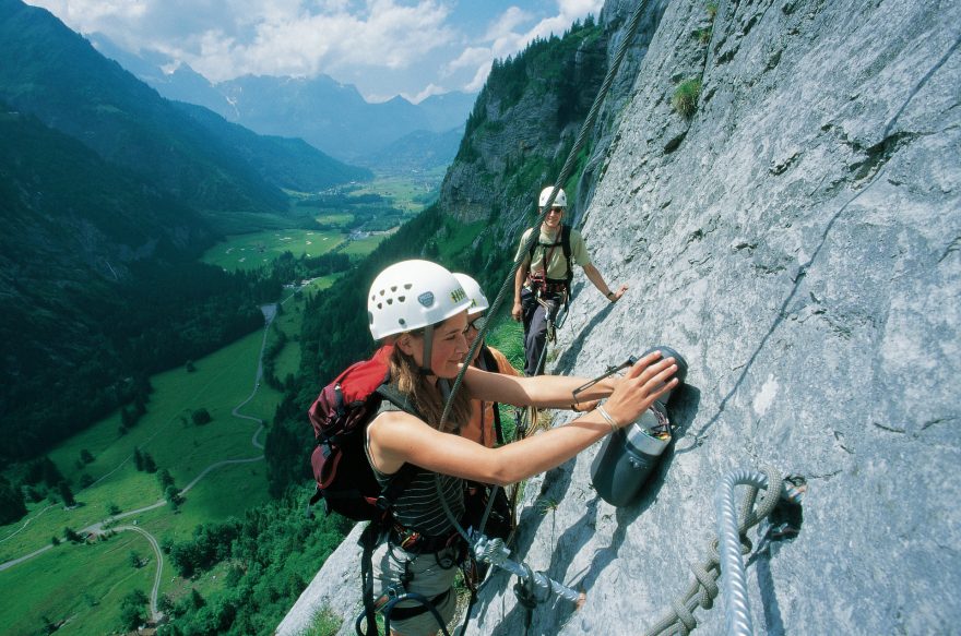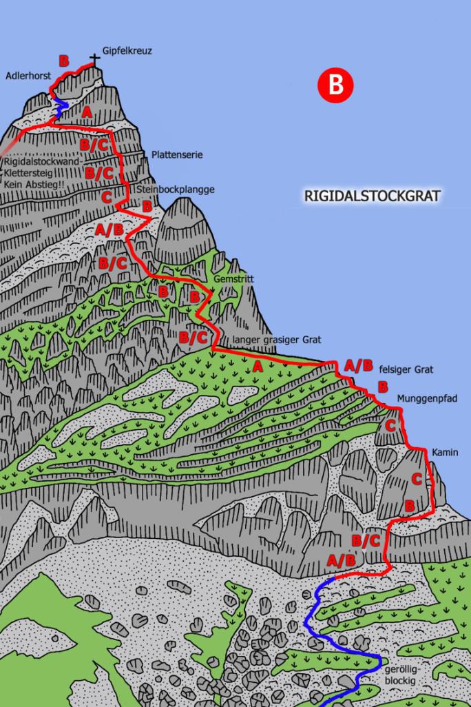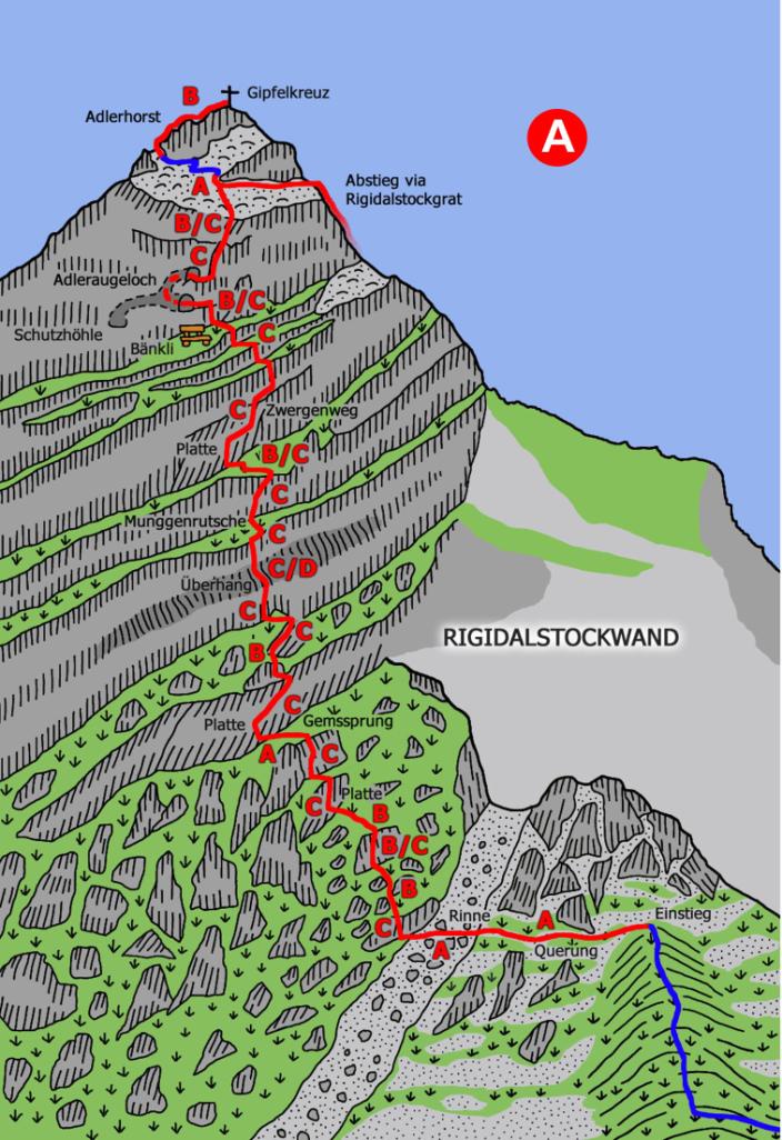 Plánek těžší varianty výstupu přes feratu Rigidalstockwand.