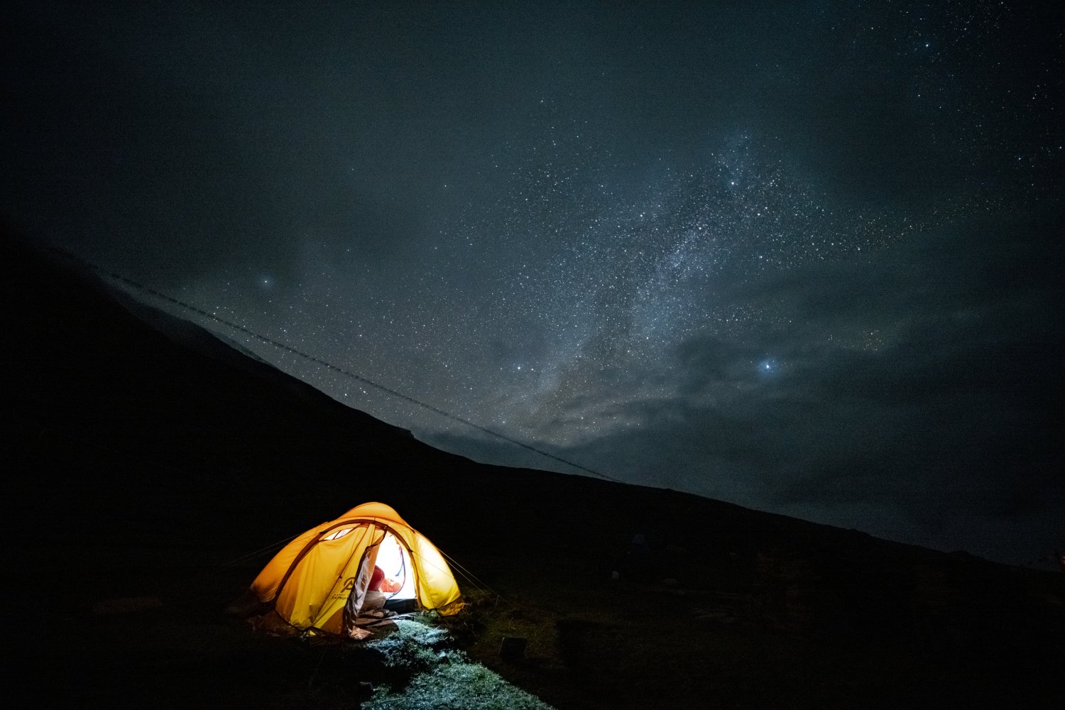 Nocování s krásným nebem s hvězdami při výstupu na Himlung Himal v Nepálu.