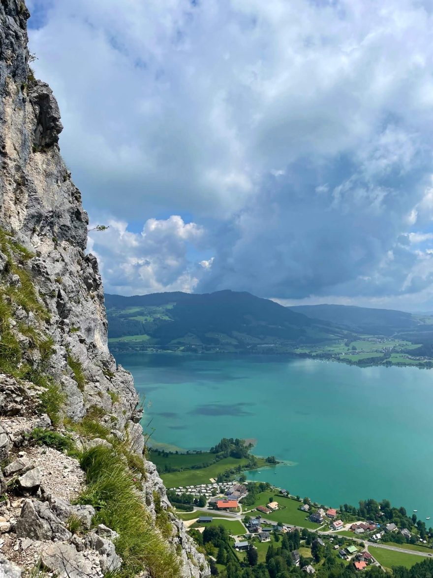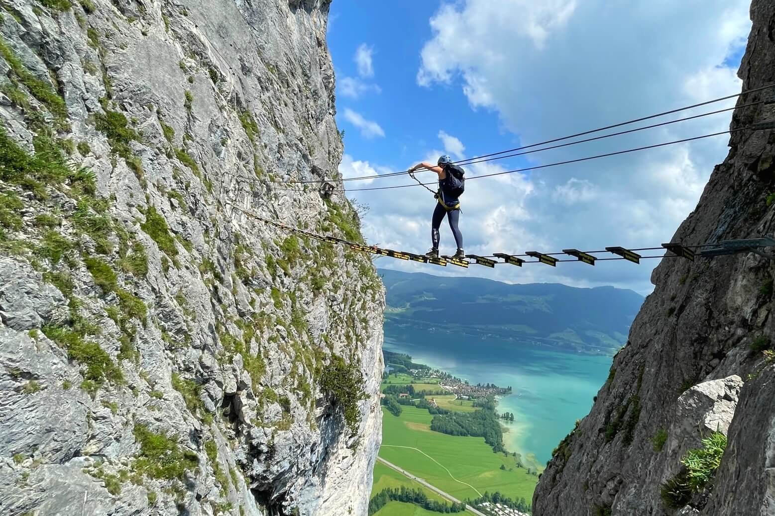 Lanový most je ikonickým místem feraty Drachenwand Klettersteig v Solné komoře. Salzkammergut, rakouské Alpy.