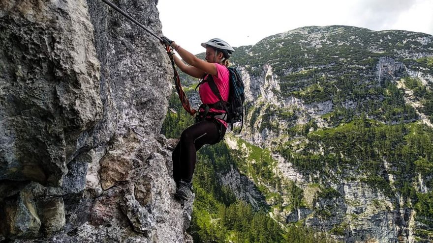Jedna z nejnáročnějších rakouských ferrat Seewand klettersteig překonává úctyhodné převýšení i převislé úseky. Solná komora, Rakousko, Alpy