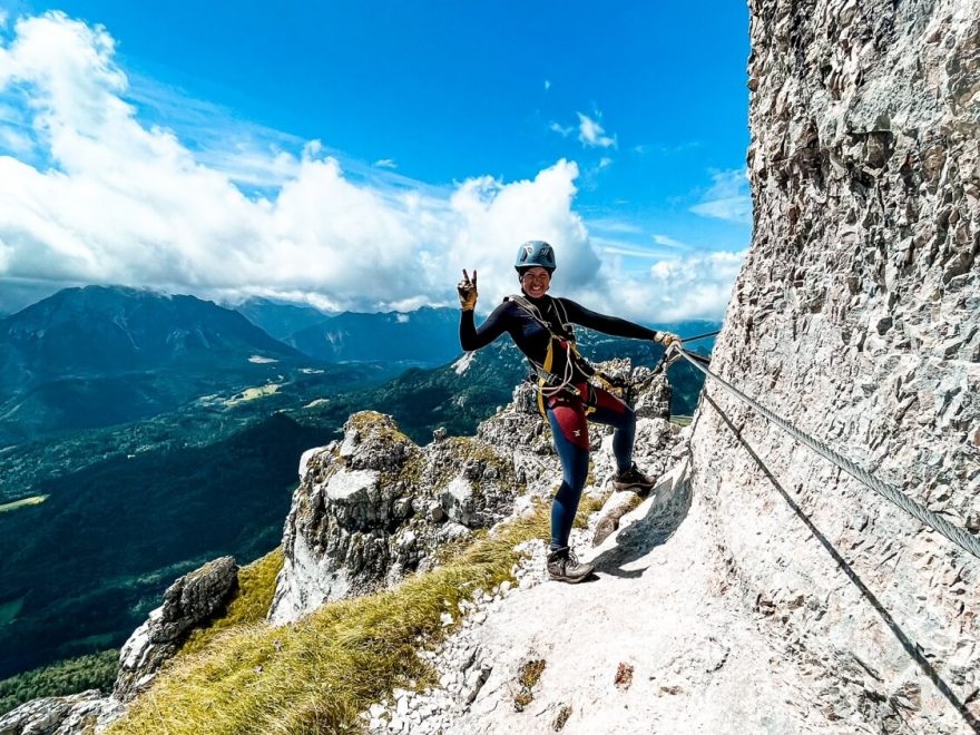 Ferrata je v některých úsecích dokonce mírně převislá a vyžaduje sílu v rukou. Ferata Sisi Loser Panorama Klettersteig, Totes Gebirge, rakouské Alpy