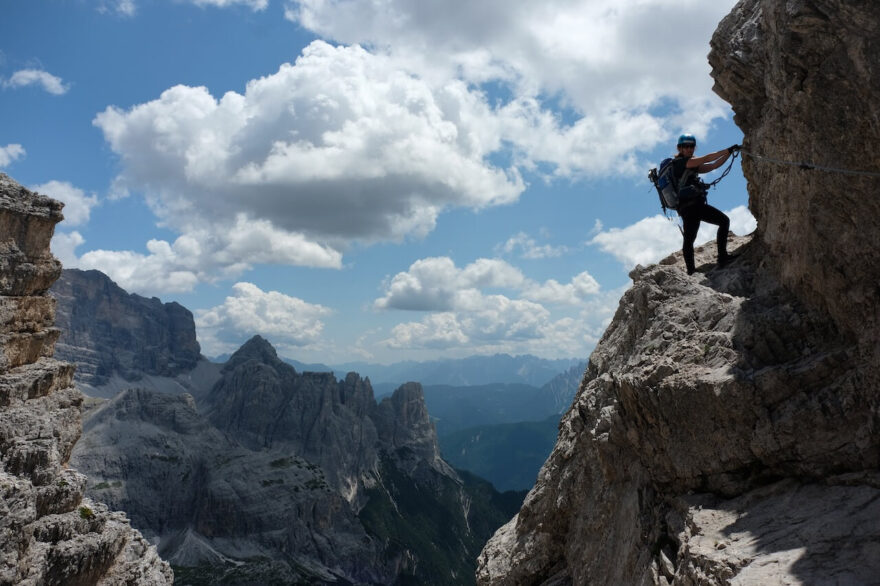 Feratový přechod v blízkosti ikonické formace Tre Cime v Dolomitech