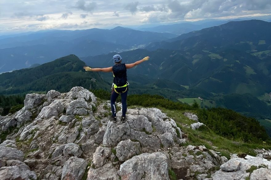 Ferata Franz Scheikl Naturfreunde Klettersteig stoupá severními svahy vrcholu Hochlantsch, rakouské Alpy