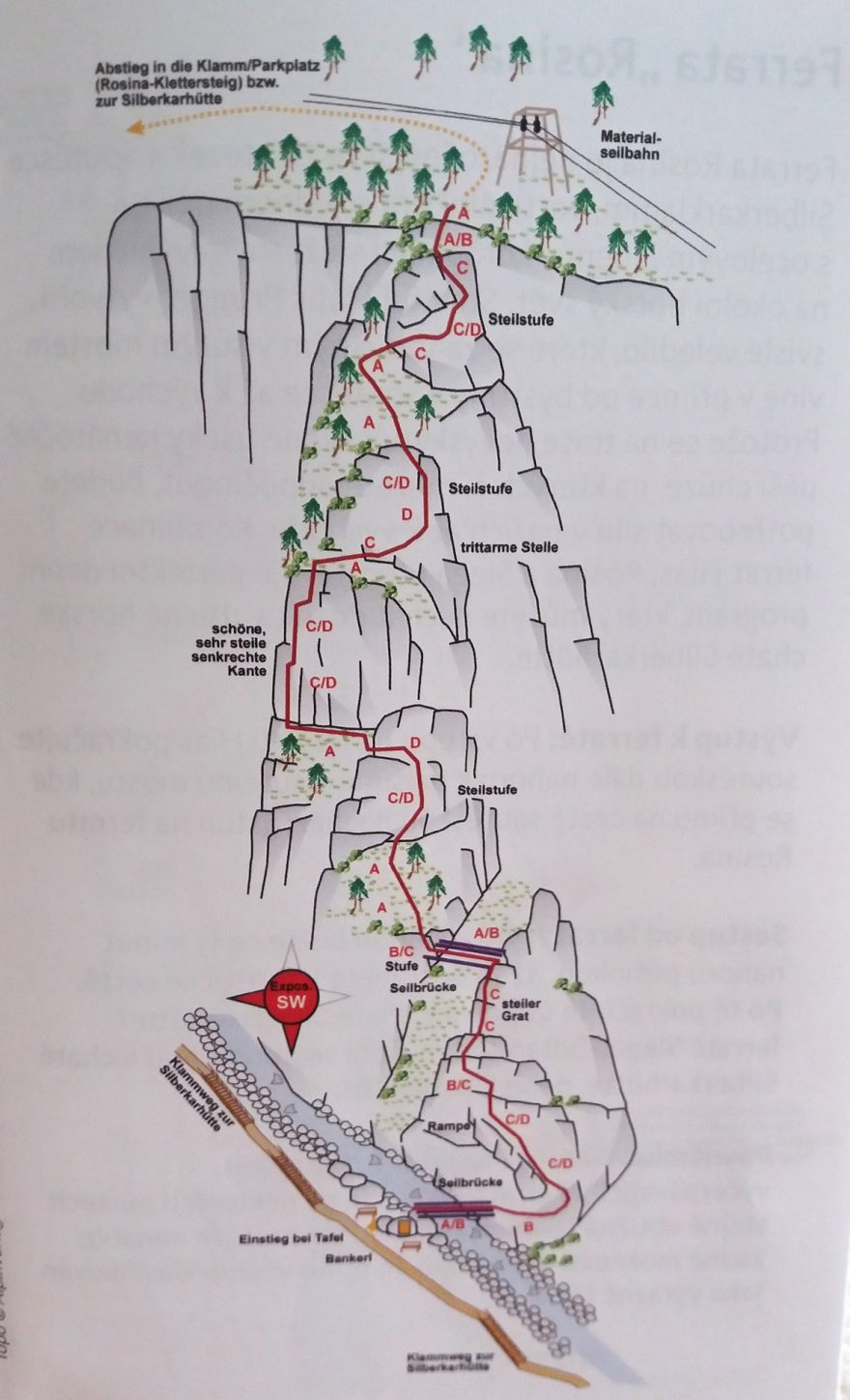 Nástup přes lanový most nad řekou v soutěsce Silberkarklamm.