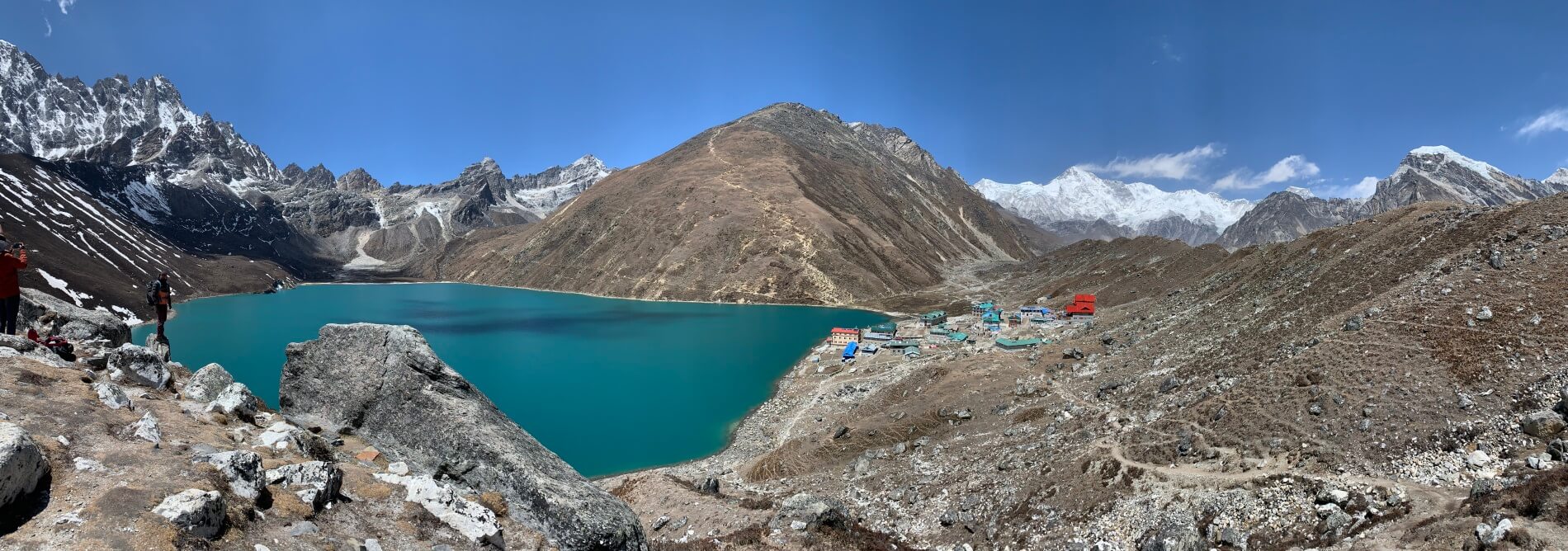 Jezero Gokyo Lake (4.750 m), uprostřed Gokyo Ri (5.357 m), vpravo jižní stěna Cho-Oyu (8.201 m)