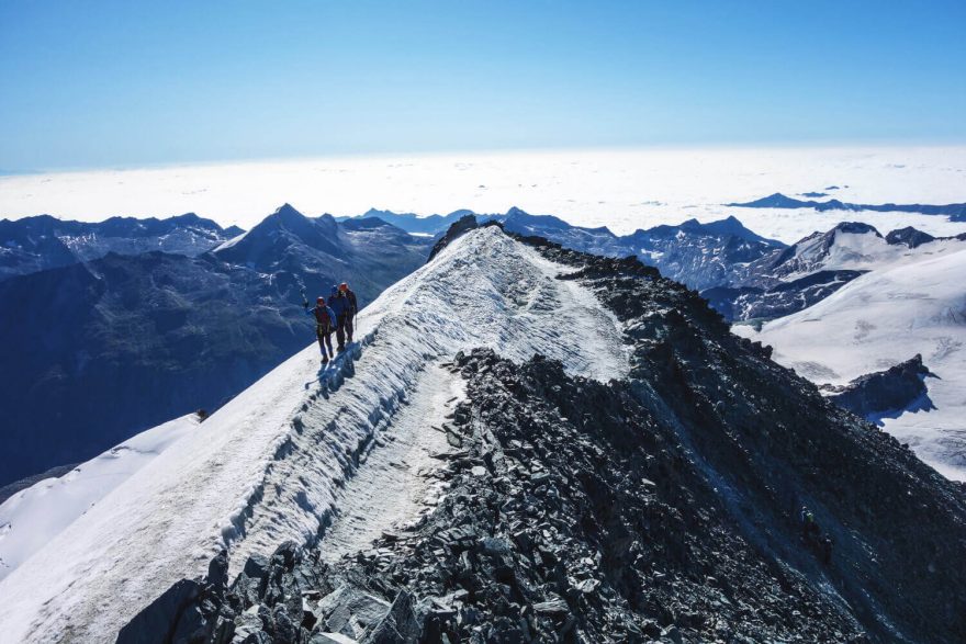 Mačky rozhodně využijete. Hohlaubgrat, Allalinhorn, Wallis, Alpy, Švýcarsko.