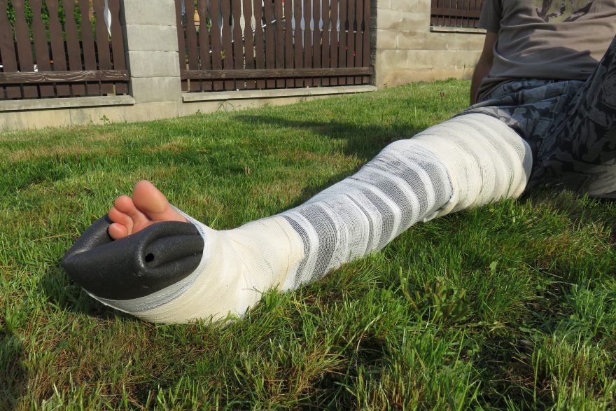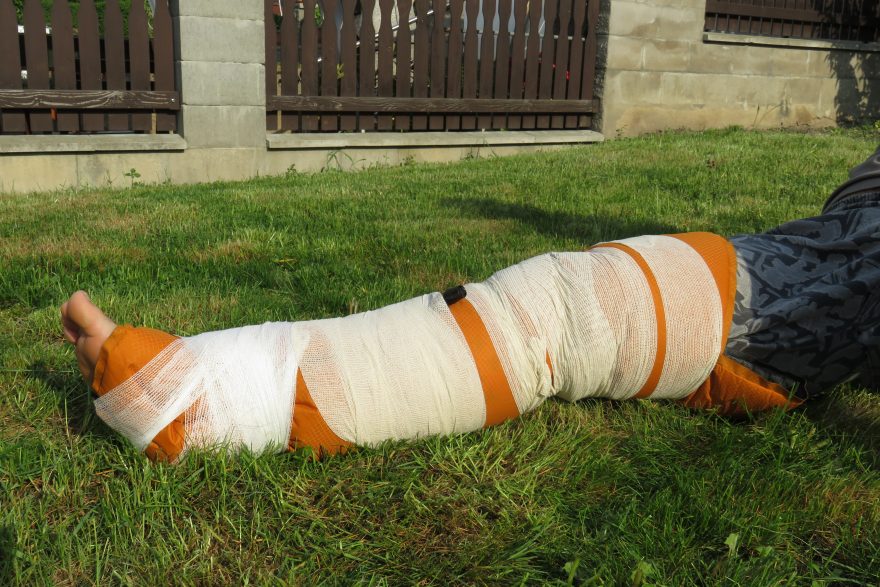 Dlaha pomocí hůlek a karimatky – hůlky ve správné délce obalíme po stranách karimatkou a přiložíme ke zraněné noze. Dlahu připevníme pomocí obvazů či trojcípých šátků.
