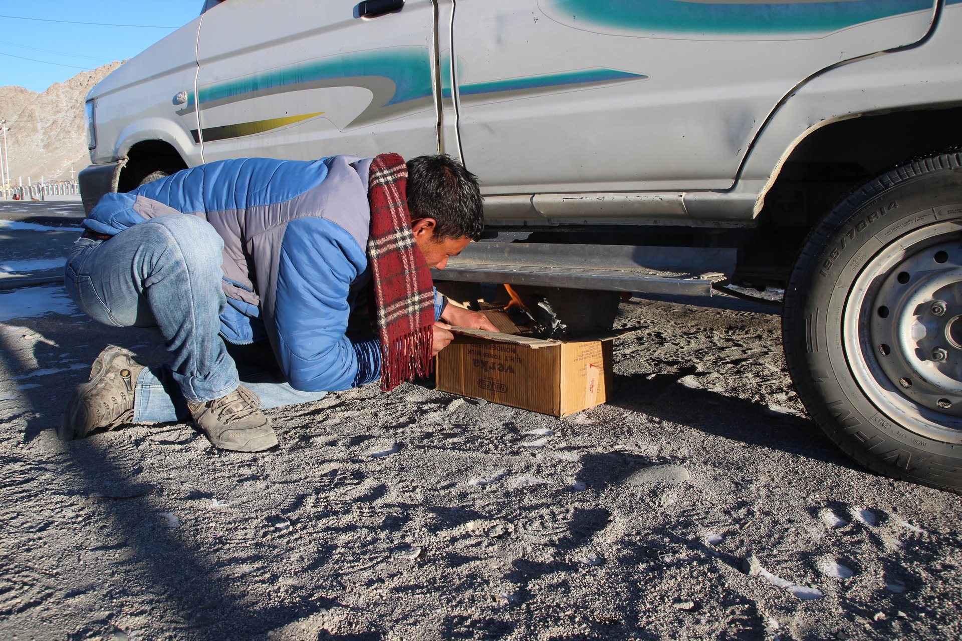 Když auto nejede, je potřeba rozdělat pod podvozkem oheň. Indie.