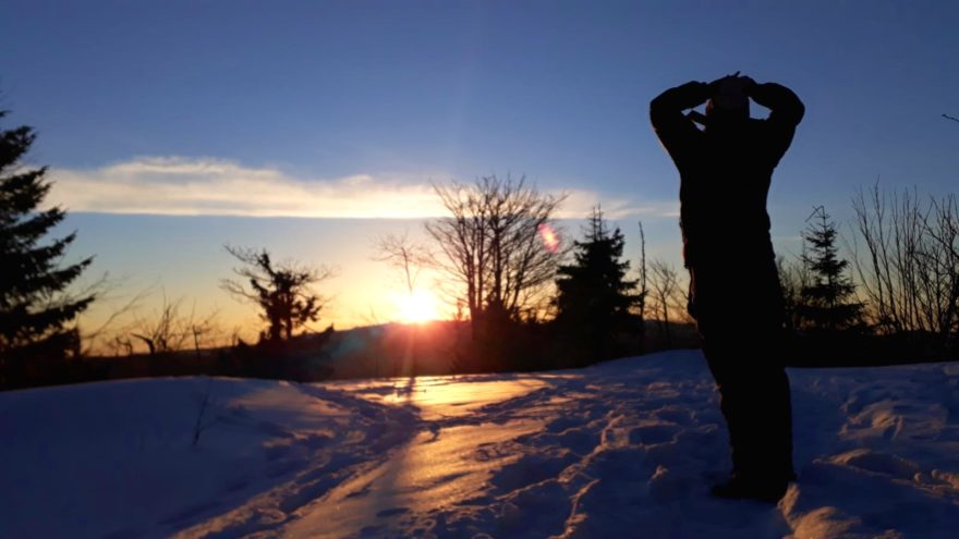 Východ slunce nad osadou Jizerka z vrcholku Bukovec (1005 m).