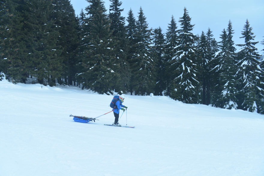 Starší děti se zahřejí pohybem a odtáhnou při tom mladšího sourozence, zabaleného do jejich vlastní péřovky, zimní outdoorové aktivity s dětmi